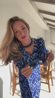 El diseño destaca por su estampado tipo ikat en tonos vibrantes que aporta un aire artesanal y sofisticado.